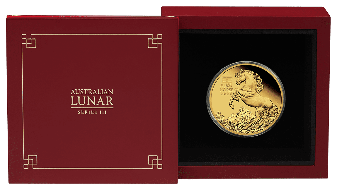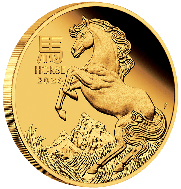 Celebrate the spirited Year of the Horse with this $100 gold proof coin, beautifully crafted by The Perth Mint from 1oz of 99.99 percent pure gold. This proof coin showcases a striking horse in motion, embodying vitality and independence, set against a detailed mountain and grassland backdrop. The design is further enhanced by the Chinese character for ‘Horse’ and the inscription ‘HORSE 2026’, complete with the iconic ‘P’ mintmark, making it a captivating addition for those interested in Chinese lunar themes or Australian collectables.