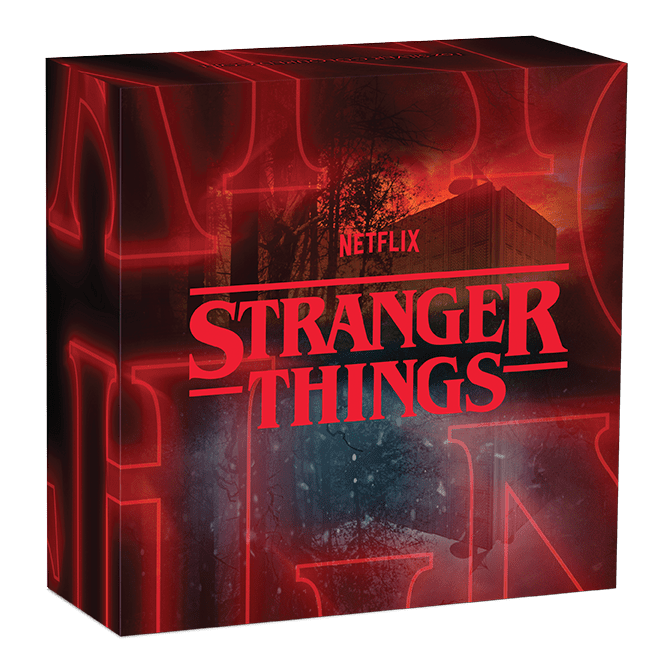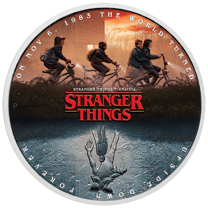 Celebrate your passion for pop culture and collectables with this officially licensed $1 silver coin, inspired by Stranger Things: The Upside Down. Strikingly coloured, the coin’s design features iconic characters—Mike, Dustin, Lucas, and Eleven—cycling bravely through Hawkins above, with Will and the menacing Demogorgon lurking in the eerie mirror world below. With the phrase “ON NOV 6, 1983 THE WORLD TURNED UPSIDE DOWN. FOREVER.” and the unmistakable STRANGER THINGS logo, it makes a vivid addition to any collection or gift for fans of the award-winning Netflix series.