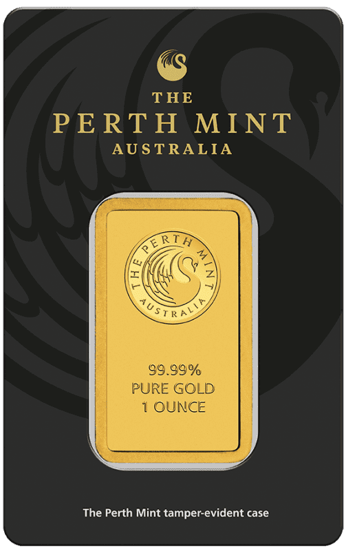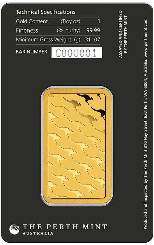 Unveil the excellence of the Perth Mint 1oz gold bar in assay card, a symbol of reliability and refinement for both collectors and investors. Crafted from pure 99.99% gold, each bar showcases the famous Perth Mint swan logo and a kangaroo motif on the reverse, reflecting Australia’s rich heritage. This gold bullion bar is encased in a tamper-evident, high-security assay card, verifying its precious metal content and weight for maximum trust and peace of mind.