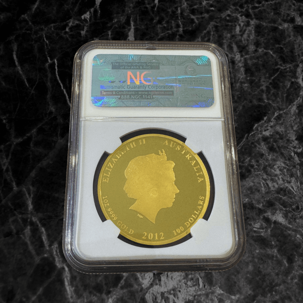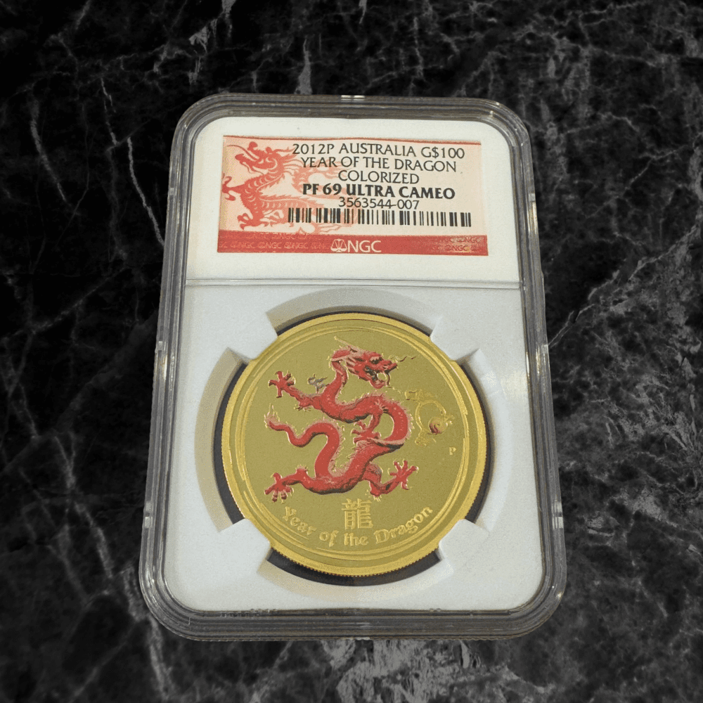Celebrate the prestige of the Lunar Year of the Dragon with this spectacular 2012 $100 proof gold coin. Expertly struck by The Perth Mint in one ounce of pure gold, its vibrant, selectively coloured dragon design stands out against the coin’s lustrous proof finish. This collector’s piece has been graded PF69 Ultra Cameo by NGC, one of the highest distinctions for numismatic quality, making it one of only fifty-three to achieve this grade out of the minuscule 1068 actual mintage. With the allure of both tradition and rarity, this gem is a show stopper for any Australian gold coin or Lunar Series collection.