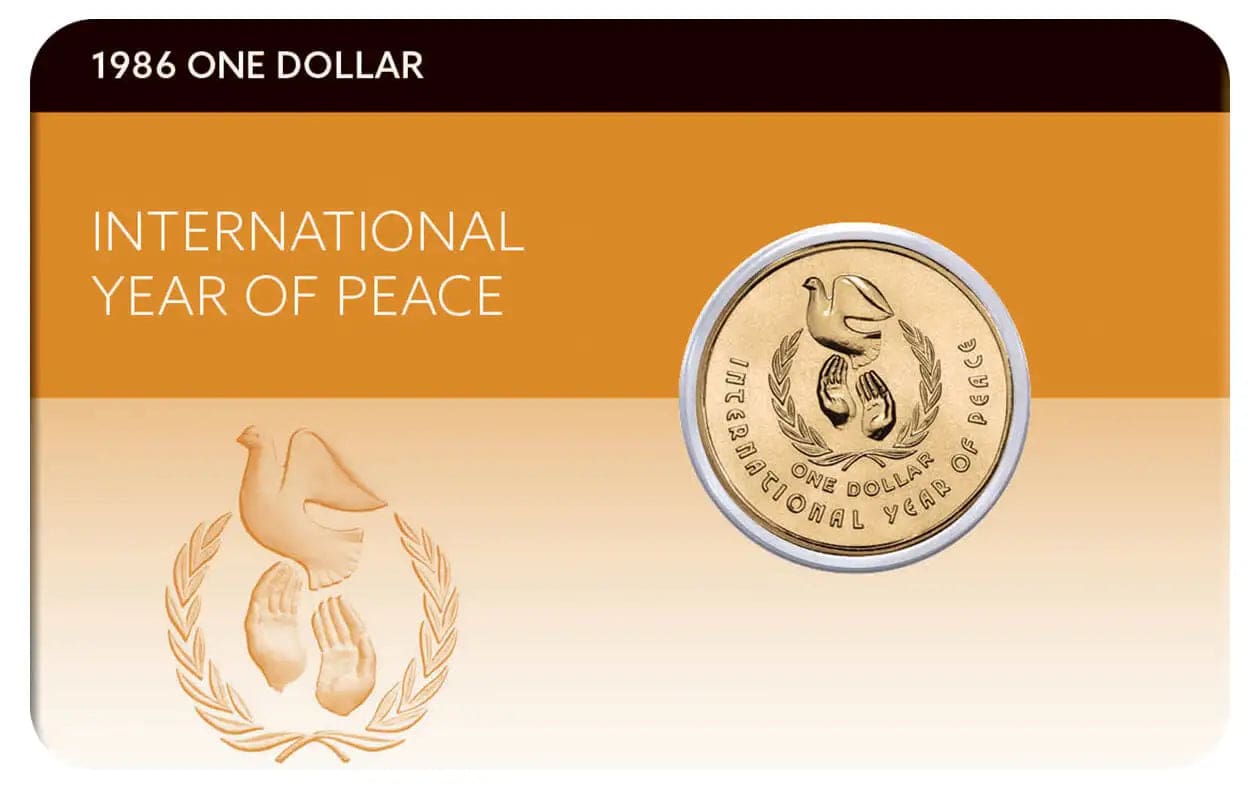 Celebrate the United Nations International Year of Peace with a 1986 $1 UNC coin crafted by the Royal Australian Mint in AlBr. Featuring the iconic reverse design of the olive branches and dove. This commemorative dollar stands as Australia’s first $1 coin that honoured global peace. This particular years coin is renown for it’s bright gold-toned finish, while the pack presentation keeps your coin protected and display-ready.