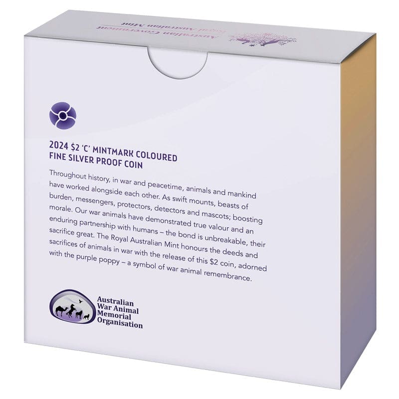 Commemorate the loyalty and bravery of wartime animal companions with this 2024 $2 War Animals Remembrance Silver Proof Coloured Coin. Strikingly coloured in regal purple, the coin’s design features the poignant poppy motif encircled by depictions of animals that served alongside Australian soldiers. Every detail is captured in fine silver, enhanced with a stunning proof finish, offering collectors and history enthusiasts a lasting tribute to animals’ invaluable contributions throughout Australia’s military campaigns.