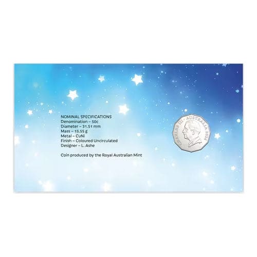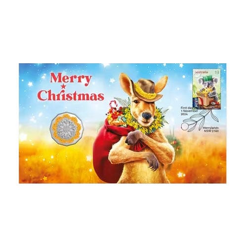 This joyful Christmas Coloured PNC features a vivid illustration of a Red Kangaroo delivering Santa’s presents. Crafted in cupro nickel, this uncirculated coin from the Royal Australian Mint brings true Australian spirit to your Christmas with its collectible finish, limited mintage of just 6500, and a special $3 Australia Post stamp marked with the First Day of Issue. Encased in a premium display card, you can admire both sides of your festive fifty cent coin while enjoying a colourful theme that celebrates native animals and the season’s warmth.