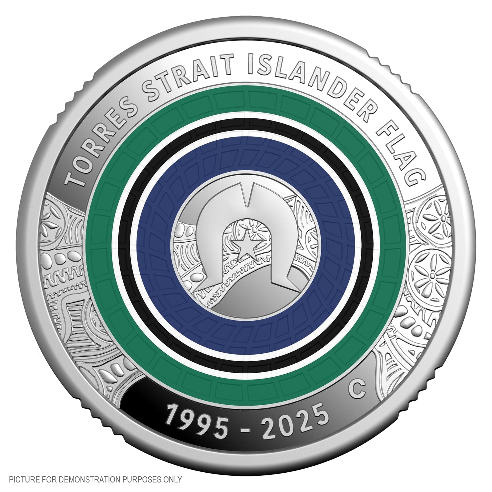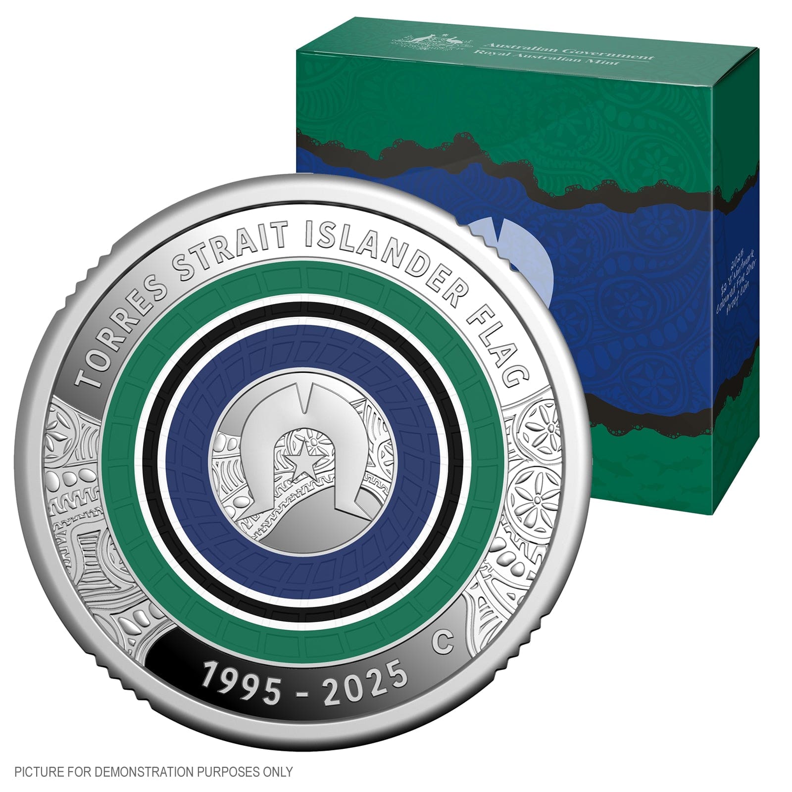 Step into Australian history with The Coin Chest and discover this remarkable silver proof coin, honouring the thirtieth anniversary of the Torres Strait Islander Flag. Struck by the Royal Australian Mint to the highest proof standard, this $2 piece radiates with full colour and a distinct “C” mintmark. Its vivid design features traditional Torres Strait Islander art, with the famed green, blue and black flag elements alongside the culturally significant Dhari headdress and five-pointed star.