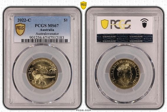 This stunning M67 graded 2022 $1 Australovenator coin celebrates Australia’s ancient past, featuring a detailed dinosaur design struck by the Royal Australian Mint. Graded by PCGS and bearing the sought-after “C” mintmark, it is crafted in fine aluminium bronze and protected in a PCGS Gold Shield holder, complete with state-of-the-art NFC anti-counterfeiting technology for authenticity assurance.