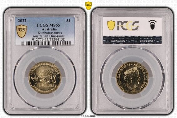 Step into Australia’s ancient past with the striking 2022 $1 Kunbarrasaurus coin, expertly graded MS65 by PCGS. Showcasing the armoured Kunbarrasaurus, this collectable uniquely blends vivid dinosaur imagery and modern minting brilliance, making it perfect for coin enthusiasts and history fans alike. Struck for Australian Dinosaurs commemorative series, the coin’s bright uncirculated finish and secure PCGS Gold Shield holder protect its value and genuine appeal. With anti-counterfeit NFC technology, collectors can trust authenticity at every step.