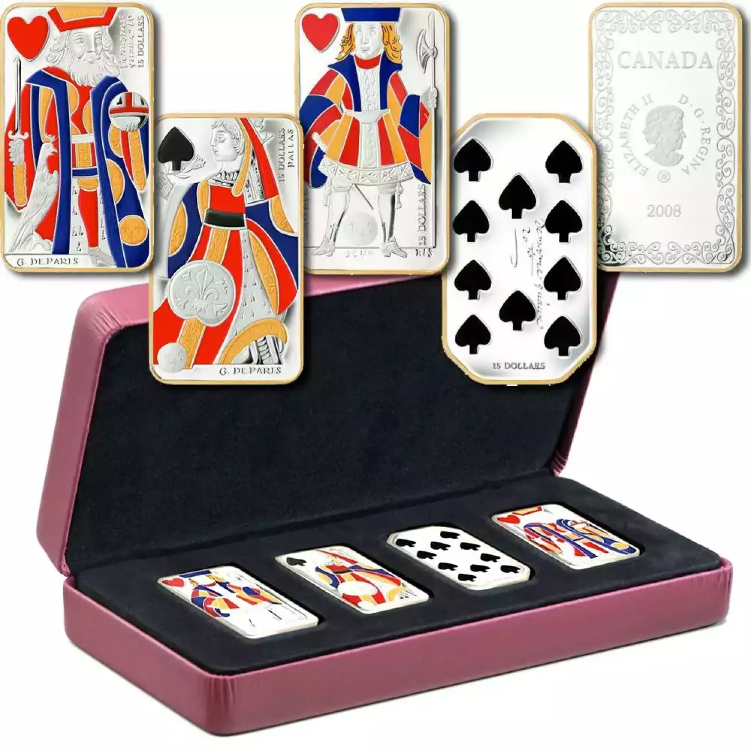 Step into the captivating world of 17th and 18th century New France, where scarcity of coinage led to the ingenious creation of “playing card money”. This dazzling four-coin $15 set from the Royal Canadian Mint, issued in 2009, beautifully captures the essence of that era. Each sterling silver coin is expertly crafted in a unique rectangular shape, finished in proof quality with vivid colour and selective gold plating, and features iconic playing cards: Jack of Hearts, Queen of Spades, Ten of Spades, and King of Hearts—making it a truly distinctive collector’s showcase.