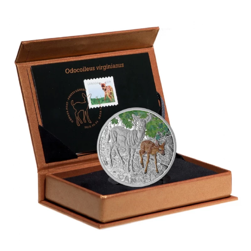 Celebrate the innocence of nature with this 2015 $20 silver coin and official stamp set showcasing a tender white-tailed deer fawn and its protective mother. Striking selective colour brings the fawn’s reddish-brown coat and bright white spots to life, perfectly framed by a vibrant green maple leaf canopy. Crafted from 99.9% pure silver in a premium proof-like finish by the Royal Canadian Mint, this limited mintage collector’s piece (just 4,000 minted) is an ideal keepsake for wildlife enthusiasts, coin collectors, or anyone captivated by baby animals. Paired with a matching stamp, this set creates a charming tribute to Canada’s natural beauty and makes the perfect gift or treasured addition to your collection.