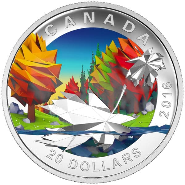 This 2016 $20 silver proof coin from the Royal Canadian Mint (RCM) highlights the beauty of geometry in art through the famed Canadian maple leaf. With exquisite sculpting and a modern polygonal design, this 1.023oz pure silver coin combines cutting-edge technology and artistry. The intricately detailed maple leaves float above a forest bathed in autumn hues, backed by an imaginative river scene, making this legal tender a visual masterpiece and an ideal addition to any collection celebrating Canadian icons.