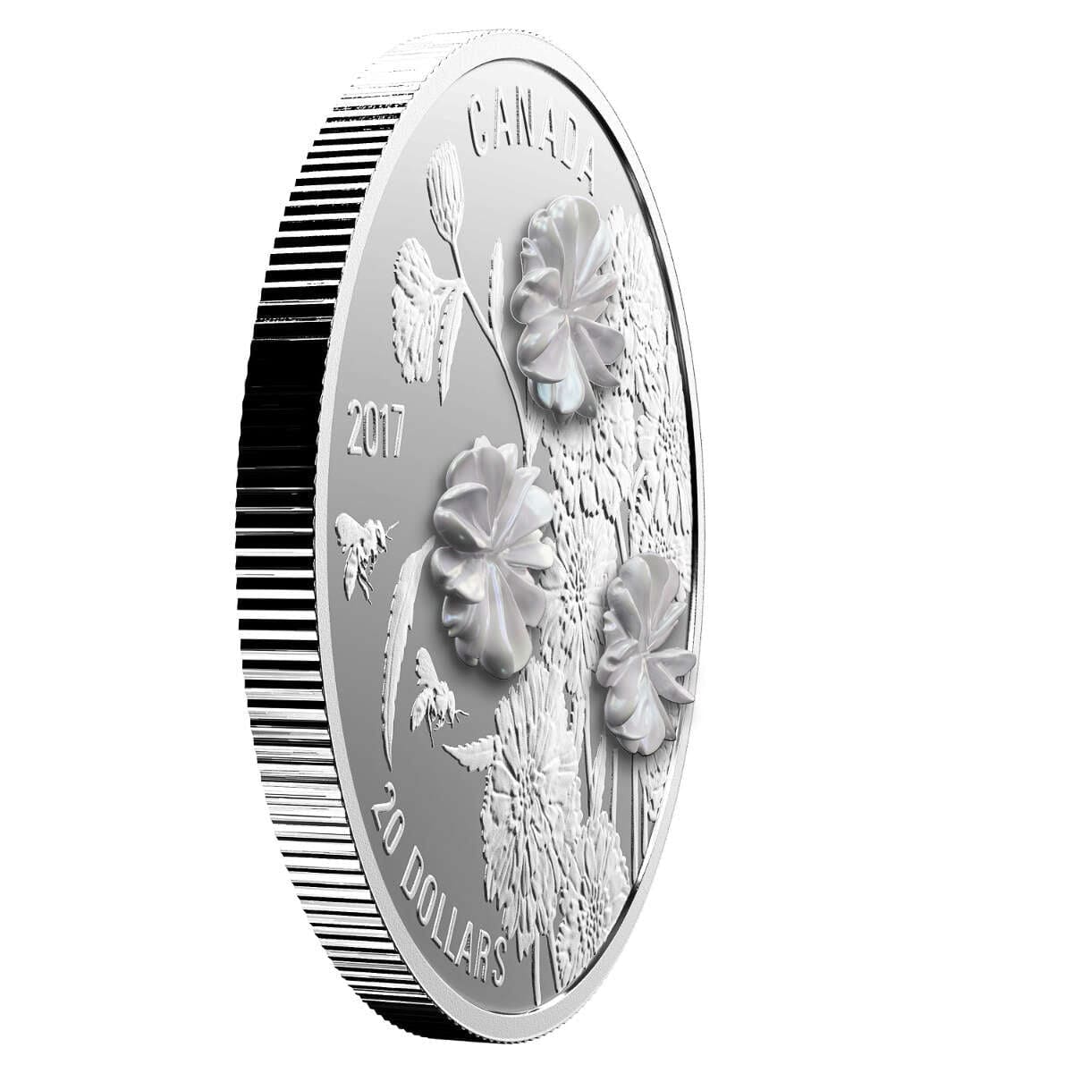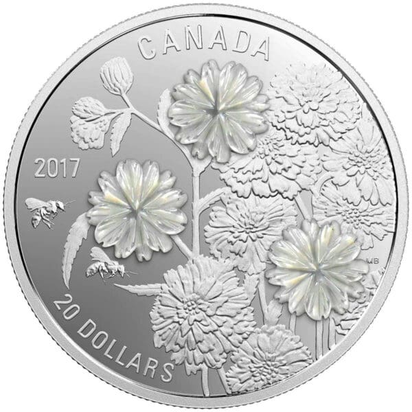 Showcasing the natural allure of Canadian spring, this collectible dazzles with its depiction of pearl yarrow blooms, artfully enhanced by mother-of-pearl inlays set against fine silver. Crafted in 1oz of pure silver and finished in proof quality by the Royal Canadian Mint, this $20 coin glimmers with intricate detailing, celebrating both floral grace and the lustrous sheen of mother-of-pearl. Adorned with delicate, double-blossom petals and highlighted by engraved bees, this piece unites art and nature, making it the perfect addition for collectors and lovers of unique silver coins.