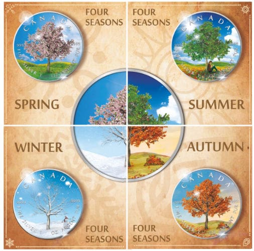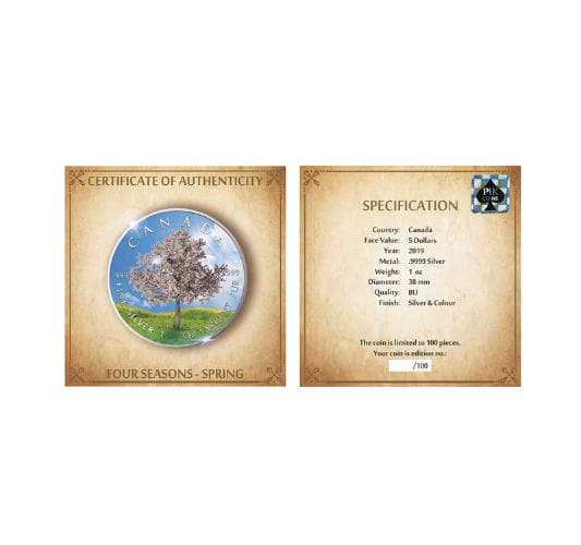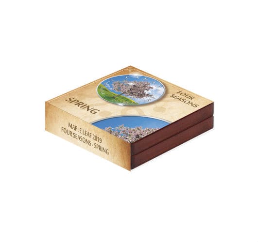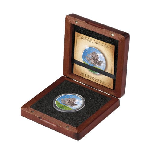 Proudly issued by the Royal Canadian Mint, this limited mintage 1oz maple leaf coin boasts a crisp proof finish and fine silver purity. Its unique colour application and seasonal theme ensure it stands out in any collection, while the $5 face value guarantees its status as legal tender. A quintessential choice for seasoned numismatists and those seeking a memorable keepsake, this Spring Four Seasons maple leaf shines as a testament to both craftsmanship and the splendour of Canadian spring.