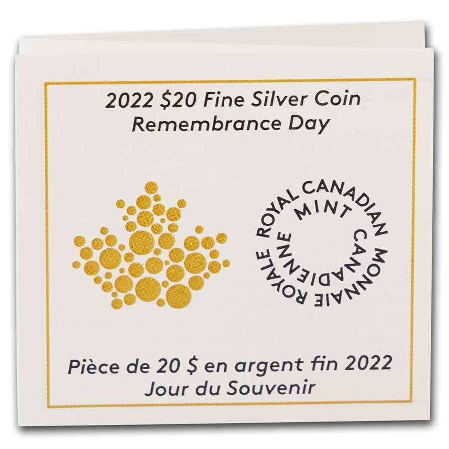 This beautifully crafted 2022 Canada Silver $20 Remembrance Day Proof coin exemplifies Canadian artistry with its highly detailed design, paying tribute to Remembrance Day and those who served. Carefully struck in pure silver and presented in a premium proof finish, the coin features poignant thematics with powerful symbols of remembrance and national pride, highlighted by frosted details and mirror-like backdrops. The $20 denomination marks it as both a collectable and a fitting tribute for Canadian history enthusiasts and lovers of unique silver coins.