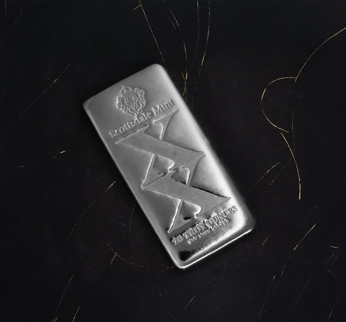 Discover a stunning addition to your silver collection with this 20oz minted silver bar from the renowned Scottsdale Mint, part of the prestigious Imperium Collection XX. Crafted from .999 fine silver, this bar shines with a sleek, high-quality finish and is instantly recognised by its impressive weight and intricate, regal design. The distinctive Scottsdale lion logo and detailed motifs make it ideal for collectors and investors who appreciate craftsmanship and value authenticity in every silver piece.